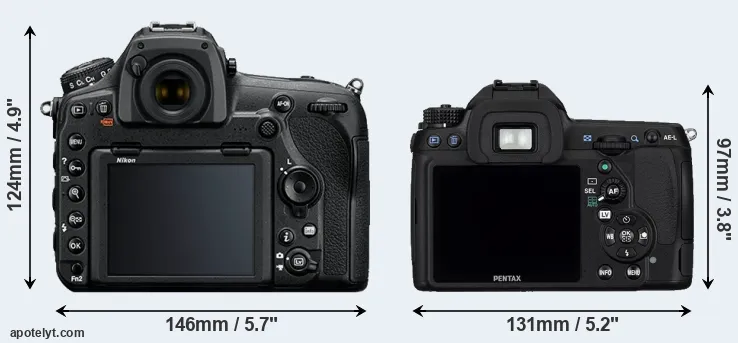 The side-by-side display below illustrates the physical size and weight of the Nikon D850 and the Pentax K-5. The two cameras are presented according to their relative size. Three consecutive perspectives from the front, the top, and the back are available. All width, height and depth dimensions are rounded to the nearest millimeter.