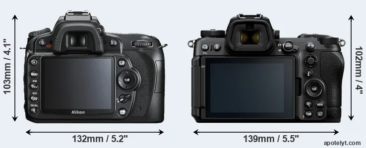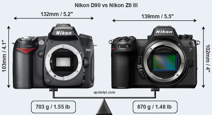 The physical size and weight of the Nikon D90 and the Nikon Z6 III are illustrated in the side-by-side display below. The two cameras are presented according to their relative size. Three consecutive perspectives from the front, the top, and the back are available. All size dimensions are rounded to the nearest millimeter.
