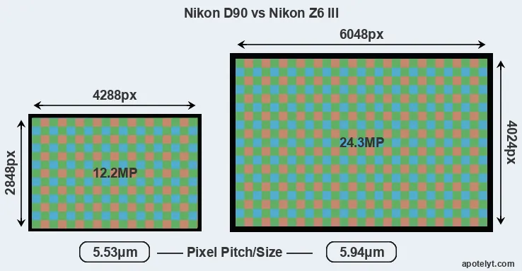 With 24.3MP, the Z6 III offers a higher resolution than the D90 (12.2MP), but the Z6 III nevertheless has larger individual pixels (pixel pitch of 5.94μm versus 5.53μm for the D90) due to its larger sensor. Moreover, the Z6 III is a much more recent model (by 15 years and 9 months) than the D90, and its sensor will have benefitted from technological advances during this time that further enhance the light gathering capacity of its pixel-units.