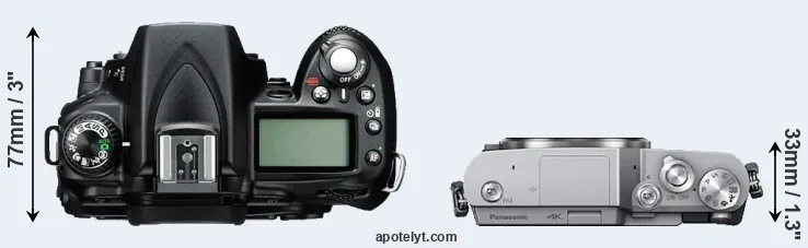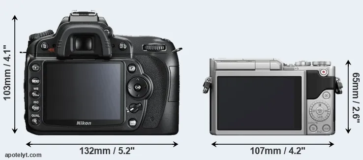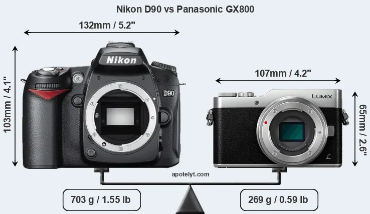The side-by-side display below illustrates the physical size and weight of the Nikon D90 and the Panasonic GX800. The two cameras are presented according to their relative size. Three consecutive perspectives from the front, the top, and the back are available. All width, height and depth measures are rounded to the nearest millimeter.