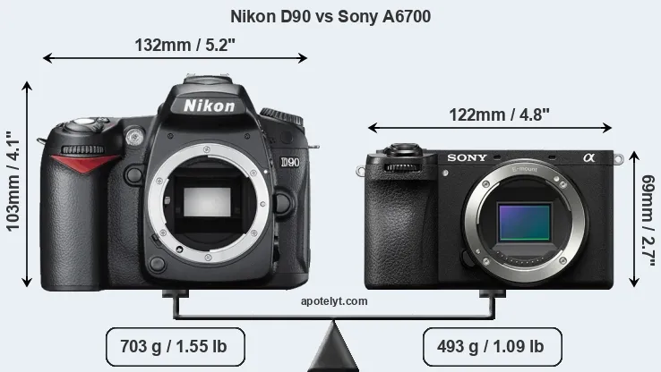 An illustration of the physical size and weight of the Nikon D90 and the Sony A6700 is provided in the side-by-side display below. The two cameras are presented according to their relative size. Three successive views from the front, the top, and the rear are shown. All width, height and depth dimensions are rounded to the nearest millimeter.