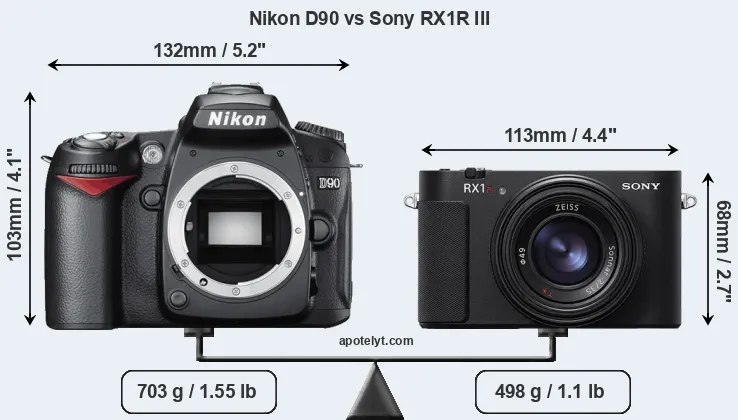 An illustration of the physical size and weight of the Nikon D90 and the Sony RX1R III is provided in the side-by-side display below. The two cameras are presented according to their relative size. Three consecutive perspectives from the front, the top, and the back are available. All width, height and depth measures are rounded to the nearest millimeter.