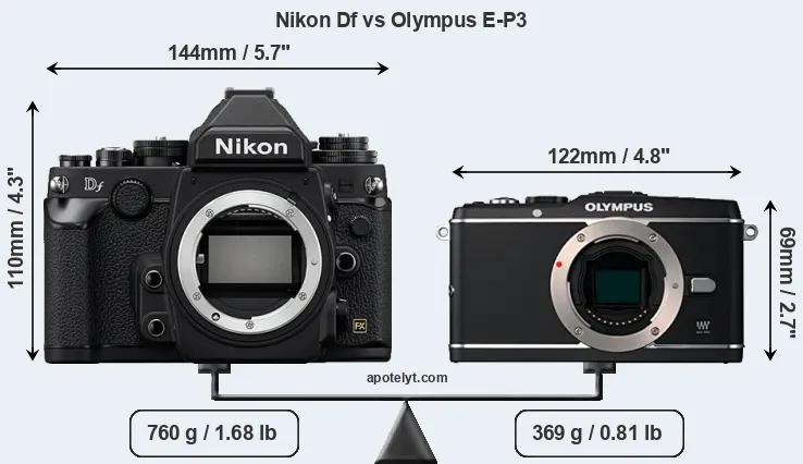 An illustration of the physical size and weight of the Nikon Df and the Olympus E-P3 is provided in the side-by-side display below. The two cameras are presented according to their relative size. Three successive views from the front, the top, and the rear are shown. All size dimensions are rounded to the nearest millimeter.