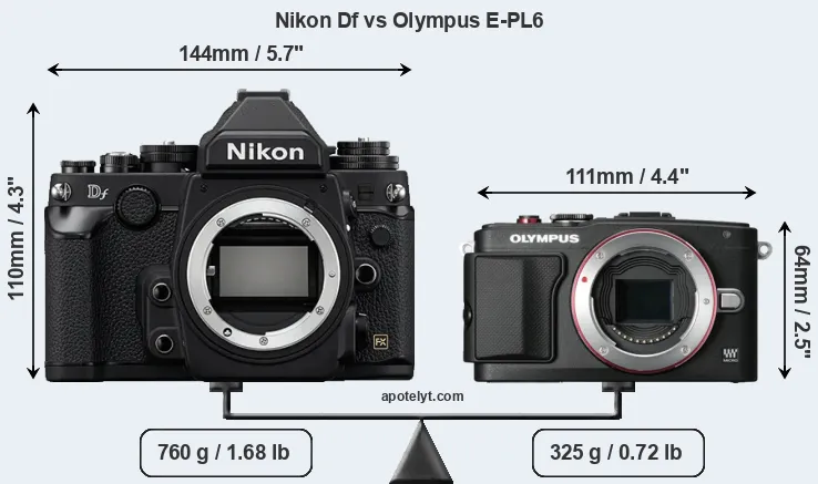 If the front view area (width x height) of the cameras is taken as an aggregate measure of their size, the Olympus E-PL6 is considerably smaller (55 percent) than the Nikon Df. Moreover, the E-PL6 is substantially lighter (57 percent) than the Df. It is worth mentioning in this context that the Df is splash and dust resistant, while the E-PL6 does not feature any corresponding weather-sealing.