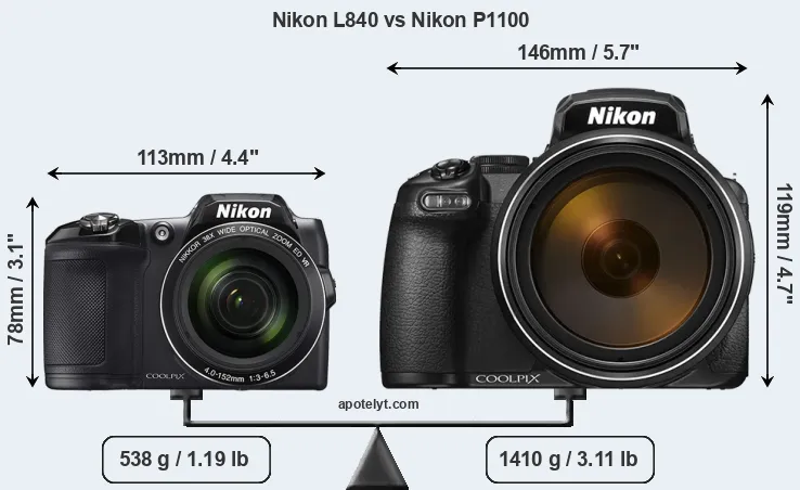 An illustration of the physical size and weight of the Nikon L840 and the Nikon P1100 is provided in the side-by-side display below. The two cameras are presented according to their relative size. Three successive views from the front, the top, and the rear are shown. All width, height and depth dimensions are rounded to the nearest millimeter.