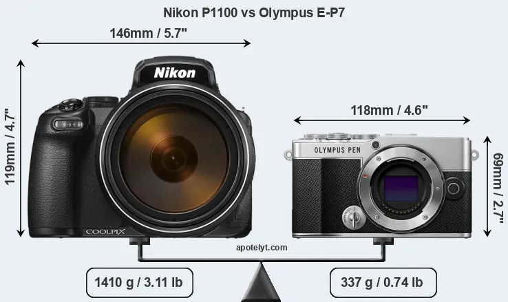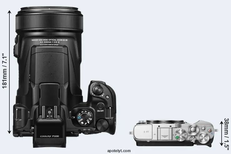 The side-by-side display below illustrates the physical size and weight of the Nikon P1100 and the Olympus E-P7. The two cameras are presented according to their relative size. Three consecutive views from the front, the top, and the rear side are shown. All width, height and depth measures are rounded to the nearest millimeter.