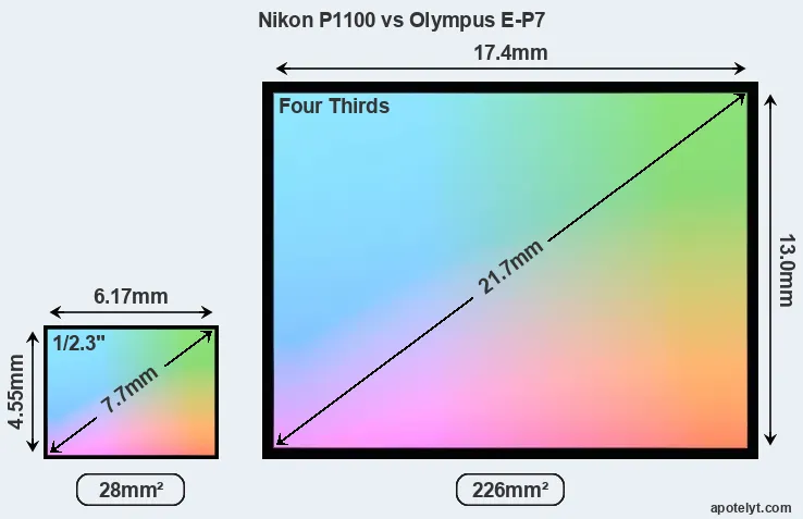 Of the two cameras under consideration, the Nikon P1100 features a 1/2.3-inch sensor and the Olympus E-P7 a Four Thirds sensor. The sensor area in the E-P7 is 707 percent bigger. As a result of these sensor size differences, the cameras have a format factor of, respectively, 5.6 and 2.0. Both cameras feature a native aspect ratio (sensor width to sensor height) of 4:3.