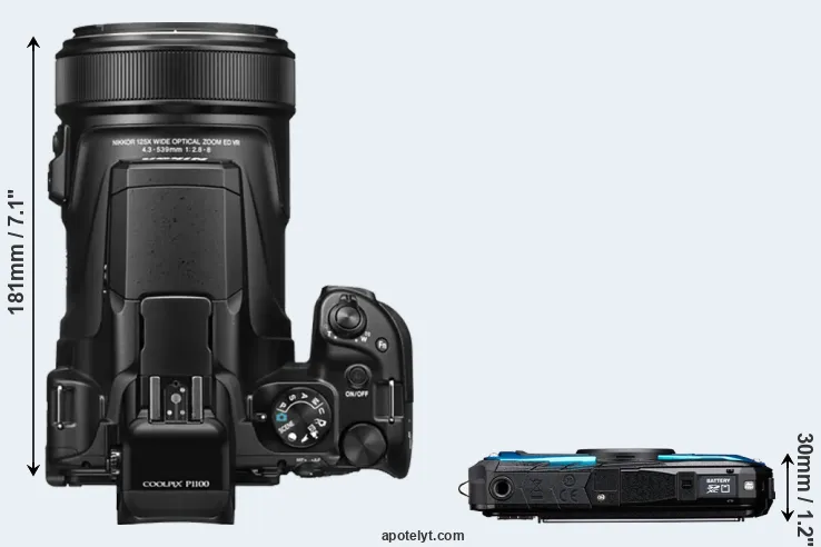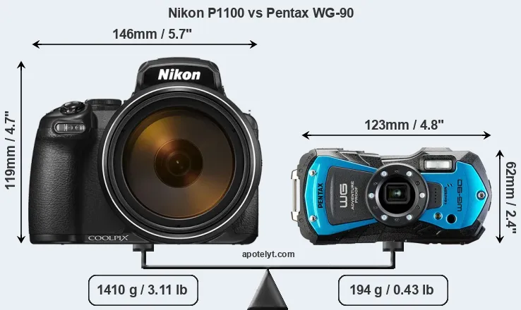 The side-by-side display below illustrates the physical size and weight of the Nikon P1100 and the Pentax WG-90. The two cameras are presented according to their relative size. Three consecutive perspectives from the front, the top, and the back are available. All width, height and depth dimensions are rounded to the nearest millimeter.