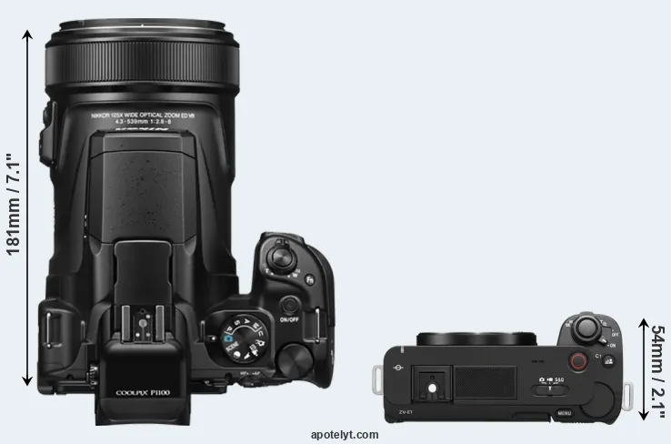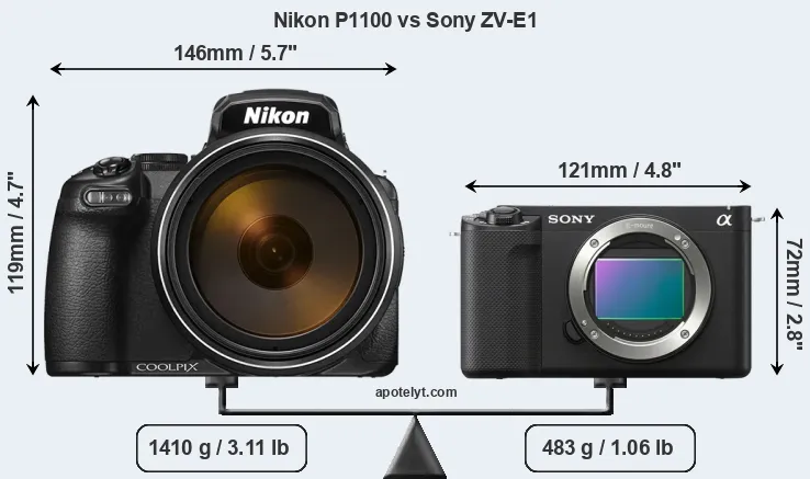 The side-by-side display below illustrates the physical size and weight of the Nikon P1100 and the Sony ZV-E1. The two cameras are presented according to their relative size. Three consecutive perspectives from the front, the top, and the back are available. All width, height and depth measures are rounded to the nearest millimeter.