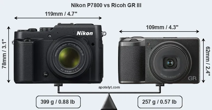An illustration of the physical size and weight of the Nikon P7800 and the Ricoh GR III is provided in the side-by-side display below. The two cameras are presented according to their relative size. Three consecutive perspectives from the front, the top, and the back are available. All width, height and depth dimensions are rounded to the nearest millimeter.