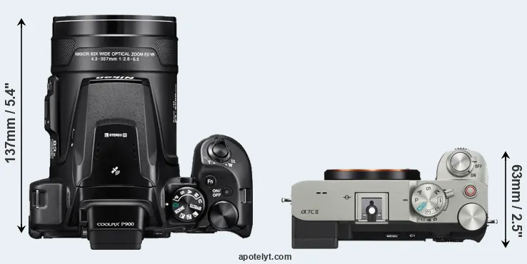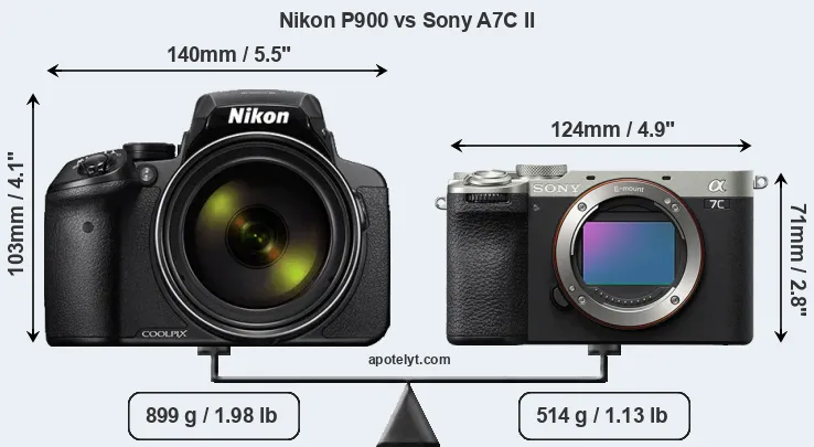 An illustration of the physical size and weight of the Nikon P900 and the Sony A7C II is provided in the side-by-side display below. The two cameras are presented according to their relative size. Three consecutive perspectives from the front, the top, and the back are available. All width, height and depth measures are rounded to the nearest millimeter.
