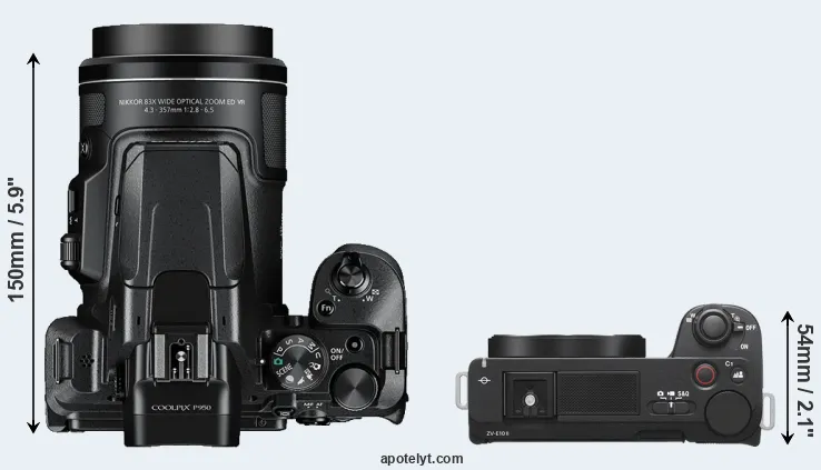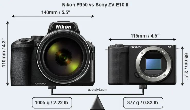 The side-by-side display below illustrates the physical size and weight of the Nikon P950 and the Sony ZV-E10 II. The two cameras are presented according to their relative size. Three consecutive perspectives from the front, the top, and the back are available. All width, height and depth measures are rounded to the nearest millimeter.