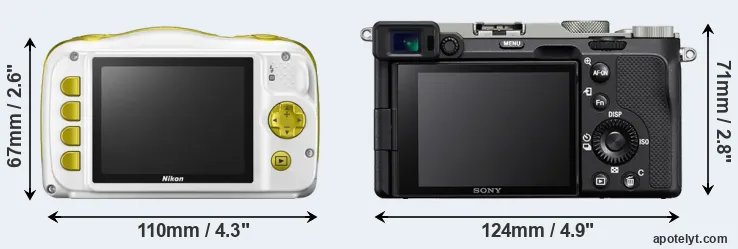 If the front view area (width x height) of the cameras is taken as an aggregate measure of their size, the Sony A7C is notably larger (19 percent) than the Nikon W150. In this context, it is worth noting that both cameras are splash and dust-proof and can, hence, be used in inclement weather conditions or harsh environments. More than that, the W150 is water-proof up to 10m and can, thus, be used for underwater photography.