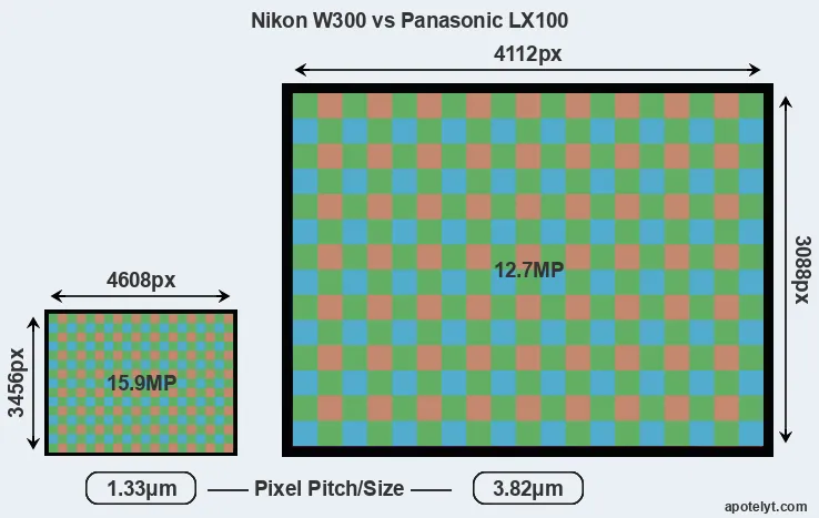 Despite having a smaller sensor, the Nikon W300 offers a higher resolution of 15.9 megapixels, compared with 12.7 MP of the Panasonic LX100. This megapixels advantage comes at the cost of a higher pixel density and a smaller size of the individual pixel (with a pixel pitch of 1.33μm versus 3.82μm for the LX100). However, it should be noted that the W300 is much more recent (by 2 years and 8 months) than the LX100, and its sensor will have benefitted from technological advances during this time that make it possible to gather light more efficiently.