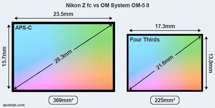 Of the two cameras under consideration, the Nikon Z fc features an APS-C sensor and the OM System OM-5 II a Four Thirds sensor. The sensor area in the OM-5 II is 39 percent smaller. As a result of these sensor size differences, the cameras have a format factor of, respectively, 1.5 and 2.0. The sensor in the Z fc has a native 3:2 aspect ratio, while the one in the OM-5 II offers a 4:3 aspect.
