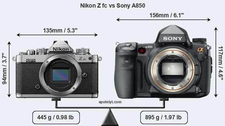 If the front view area (width x height) of the cameras is taken as an aggregate measure of their size, the Sony A850 is considerably larger (44 percent) than the Nikon Z fc. Moreover, the A850 is substantially heavier (101 percent) than the Z fc. It is noteworthy in this context that the A850 is splash and dust-proof, while the Z fc does not feature any corresponding weather-sealing.