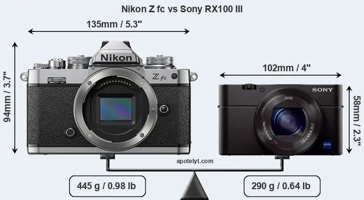 An illustration of the physical size and weight of the Nikon Z fc and the Sony RX100 III is provided in the side-by-side display below. The two cameras are presented according to their relative size. Three successive views from the front, the top, and the rear are shown. All width, height and depth dimensions are rounded to the nearest millimeter.