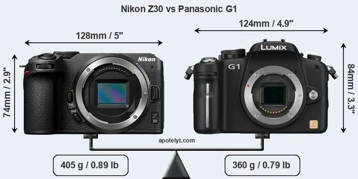 If the front view area (width x height) of the cameras is taken as an aggregate measure of their size, the Panasonic G1 is notably larger (10 percent) than the Nikon Z30. However, the G1 is markedly lighter (11 percent) than the Z30. It is worth mentioning in this context that the Z30 is splash and dust resistant, while the G1 does not feature any corresponding weather-sealing.