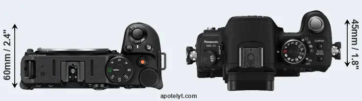 The physical size and weight of the Nikon Z30 and the Panasonic G1 are illustrated in the side-by-side display below. The two cameras are presented according to their relative size. Three consecutive views from the front, the top, and the rear side are shown. All size dimensions are rounded to the nearest millimeter.