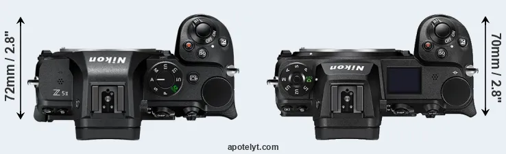 The physical size and weight of the Nikon Z5 II and the Nikon Z7 II are illustrated in the side-by-side display below. The two cameras are presented according to their relative size. Three successive views from the front, the top, and the rear are shown. All width, height and depth measures are rounded to the nearest millimeter.