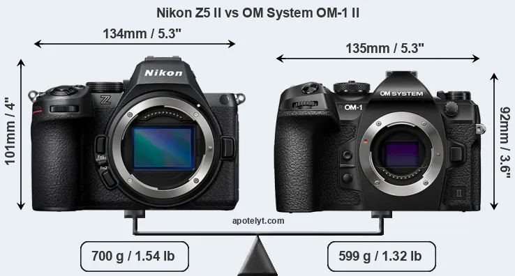 An illustration of the physical size and weight of the Nikon Z5 II and the OM System OM-1 II is provided in the side-by-side display below. The two cameras are presented according to their relative size. Three successive views from the front, the top, and the rear are shown. All width, height and depth measures are rounded to the nearest millimeter.