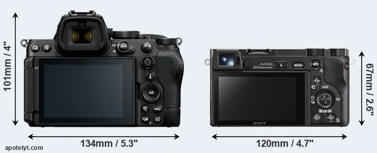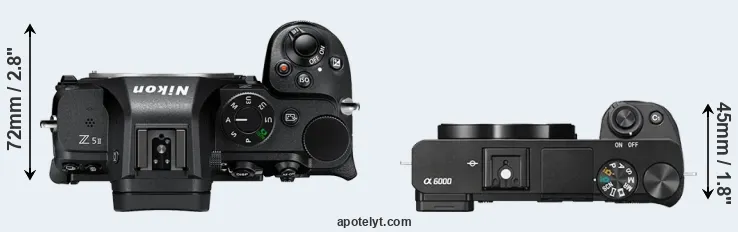 The physical size and weight of the Nikon Z5 II and the Sony A6000 are illustrated in the side-by-side display below. The two cameras are presented according to their relative size. Three consecutive perspectives from the front, the top, and the back are available. All width, height and depth dimensions are rounded to the nearest millimeter.
