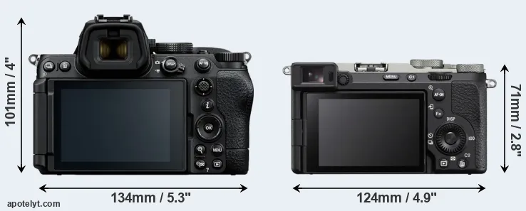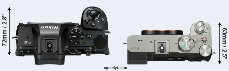 The physical size and weight of the Nikon Z5 II and the Sony A7C II are illustrated in the side-by-side display below. The two cameras are presented according to their relative size. Three consecutive perspectives from the front, the top, and the back are available. All width, height and depth measures are rounded to the nearest millimeter.