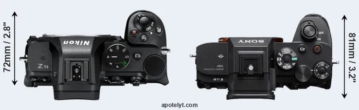 The side-by-side display below illustrates the physical size and weight of the Nikon Z5 II and the Sony A7S III. The two cameras are presented according to their relative size. Three successive views from the front, the top, and the rear are shown. All size dimensions are rounded to the nearest millimeter.