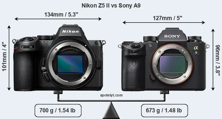 The physical size and weight of the Nikon Z5 II and the Sony A9 are illustrated in the side-by-side display below. The two cameras are presented according to their relative size. Three consecutive perspectives from the front, the top, and the back are available. All width, height and depth dimensions are rounded to the nearest millimeter.