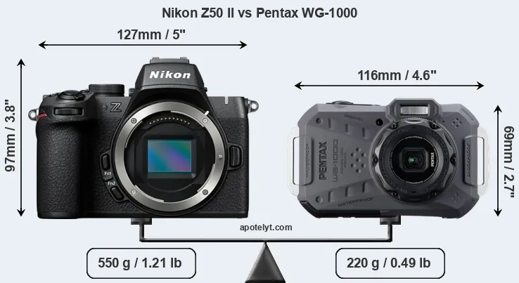 An illustration of the physical size and weight of the Nikon Z50 II and the Pentax WG-1000 is provided in the side-by-side display below. The two cameras are presented according to their relative size. Three consecutive views from the front, the top, and the rear side are shown. All size dimensions are rounded to the nearest millimeter.