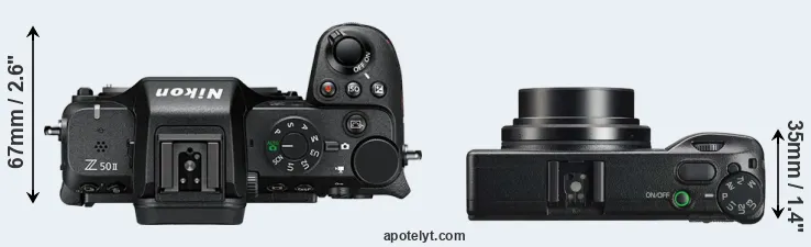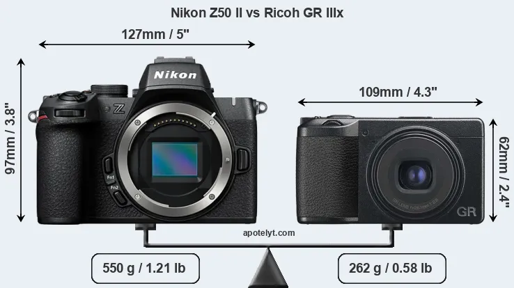 The above size and weight comparisons are to some extent incomplete and possibly misleading, as the GR IIIx has a lens built in, whereas the Z50 II is an interchangeable lens camera that requires a separate lens. Attaching the latter will add extra weight and bulk to the setup.