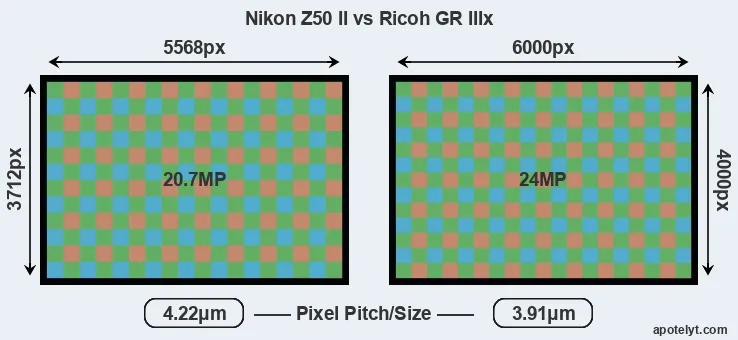 | Sensor Specs | Nikon Z50 II | Ricoh GR IIIx |