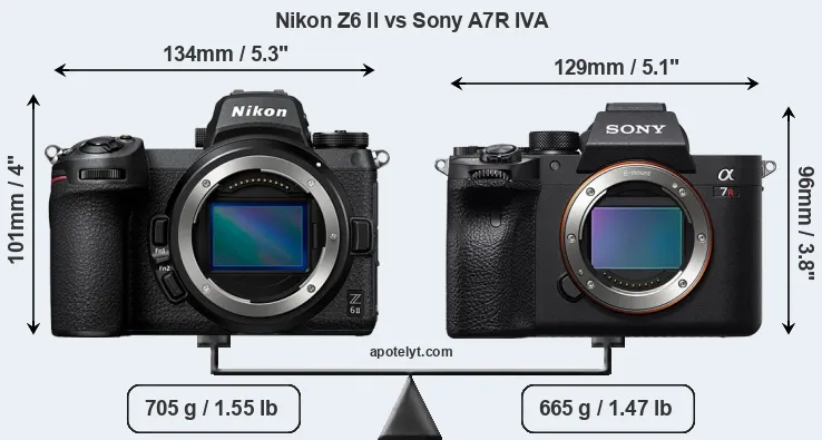 An illustration of the physical size and weight of the Nikon Z6 II and the Sony A7R IVA is provided in the side-by-side display below. The two cameras are presented according to their relative size. Three consecutive views from the front, the top, and the rear side are shown. All width, height and depth measures are rounded to the nearest millimeter.