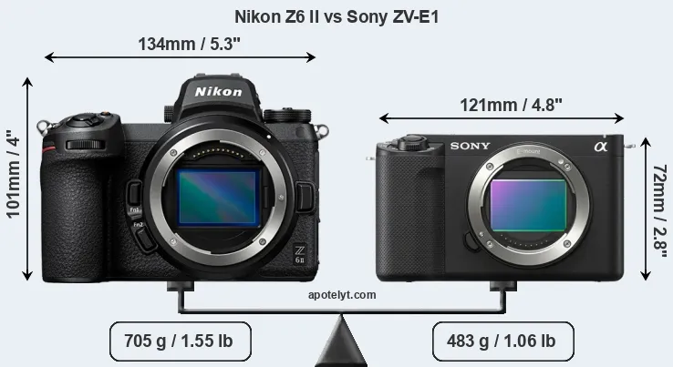 An illustration of the physical size and weight of the Nikon Z6 II and the Sony ZV-E1 is provided in the side-by-side display below. The two cameras are presented according to their relative size. Three successive views from the front, the top, and the rear are shown. All width, height and depth measures are rounded to the nearest millimeter.