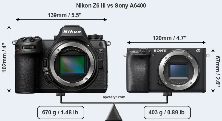 The physical size and weight of the Nikon Z6 III and the Sony A6400 are illustrated in the side-by-side display below. The two cameras are presented according to their relative size. Three successive views from the front, the top, and the rear are shown. All width, height and depth measures are rounded to the nearest millimeter.