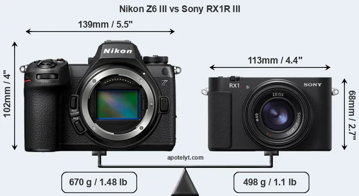 The physical size and weight of the Nikon Z6 III and the Sony RX1R III are illustrated in the side-by-side display below. The two cameras are presented according to their relative size. Three consecutive perspectives from the front, the top, and the back are available. All width, height and depth dimensions are rounded to the nearest millimeter.