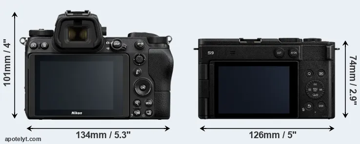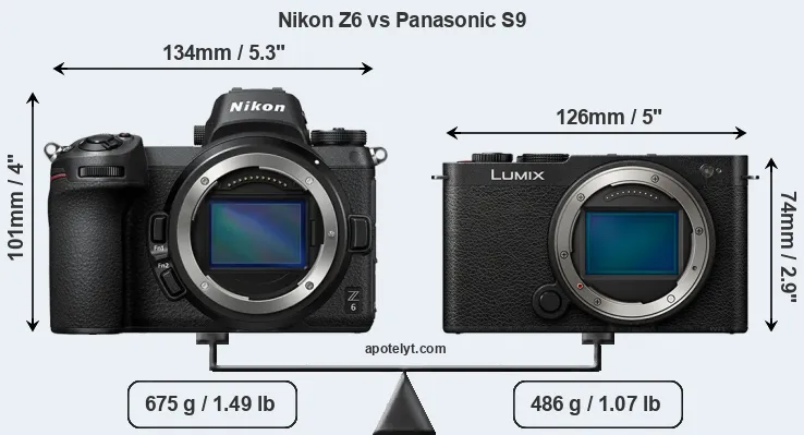 An illustration of the physical size and weight of the Nikon Z6 and the Panasonic S9 is provided in the side-by-side display below. The two cameras are presented according to their relative size. Three successive views from the front, the top, and the rear are shown. All width, height and depth dimensions are rounded to the nearest millimeter.