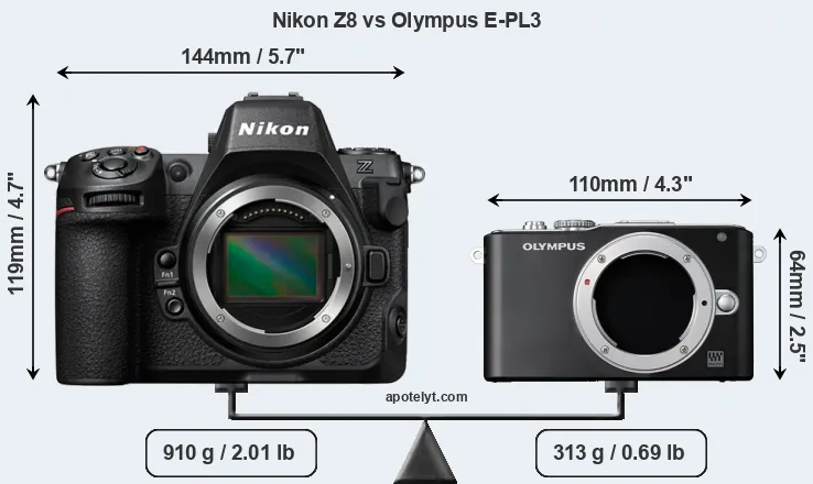 If the front view area (width x height) of the cameras is taken as an aggregate measure of their size, the Olympus E-PL3 is considerably smaller (59 percent) than the Nikon Z8. Moreover, the E-PL3 is substantially lighter (66 percent) than the Z8. It is worth mentioning in this context that the Z8 is splash and dust resistant, while the E-PL3 does not feature any corresponding weather-sealing.