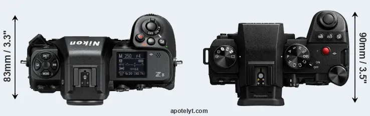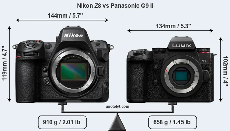 The side-by-side display below illustrates the physical size and weight of the Nikon Z8 and the Panasonic G9 II. The two cameras are presented according to their relative size. Three consecutive perspectives from the front, the top, and the back are available. All width, height and depth measures are rounded to the nearest millimeter.