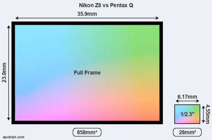 Of the two cameras under consideration, the Nikon Z8 features a full frame sensor and the Pentax Q a 1/2.3-inch sensor. The sensor area in the Pentax Q is 97 percent smaller. As a result of these sensor size differences, the cameras have a format factor of, respectively, 1.0 and 5.6. The sensor in the Z8 has a native 3:2 aspect ratio, while the one in the Pentax Q offers a 4:3 aspect.