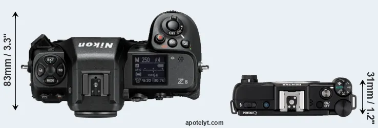 The physical size and weight of the Nikon Z8 and the Pentax Q are illustrated in the side-by-side display below. The two cameras are presented according to their relative size. Three consecutive perspectives from the front, the top, and the back are available. All size dimensions are rounded to the nearest millimeter.