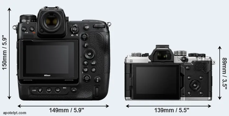 The side-by-side display below illustrates the physical size and weight of the Nikon Z9 and the OM System OM-3. The two cameras are presented according to their relative size. Three consecutive perspectives from the front, the top, and the back are available. All width, height and depth measures are rounded to the nearest millimeter.