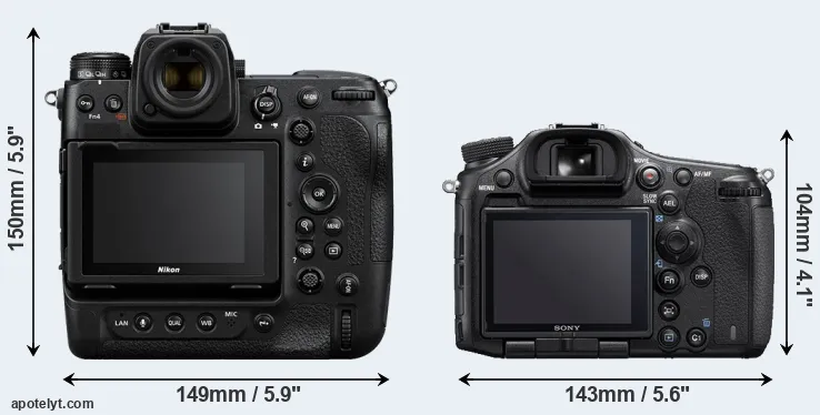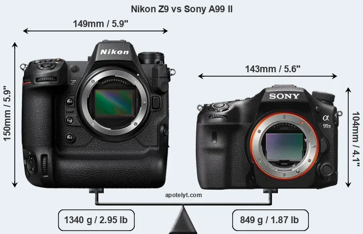 The side-by-side display below illustrates the physical size and weight of the Nikon Z9 and the Sony A99 II. The two cameras are presented according to their relative size. Three consecutive perspectives from the front, the top, and the back are available. All width, height and depth measures are rounded to the nearest millimeter.