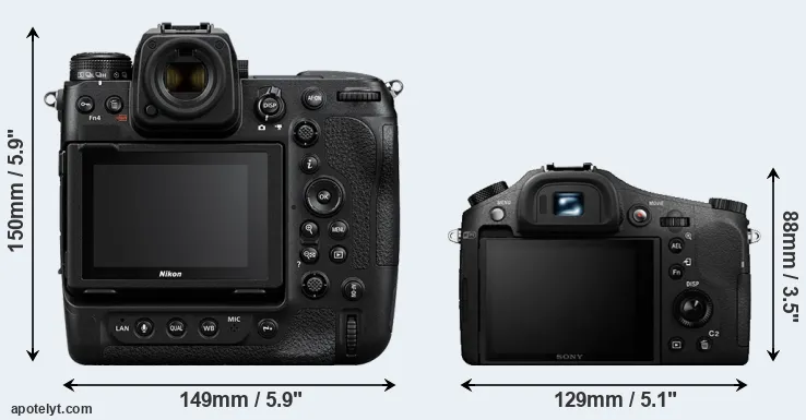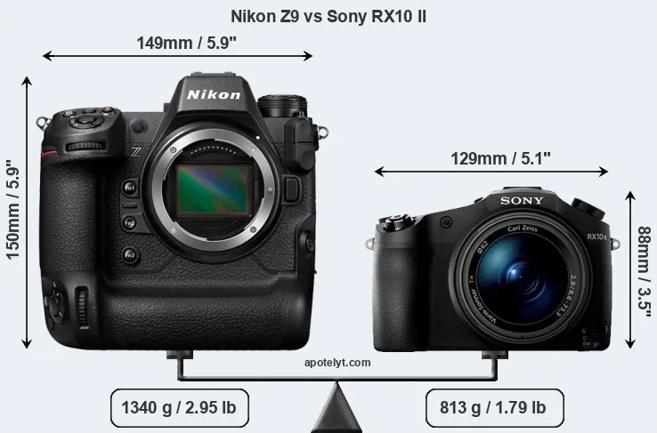 An illustration of the physical size and weight of the Nikon Z9 and the Sony RX10 II is provided in the side-by-side display below. The two cameras are presented according to their relative size. Three consecutive views from the front, the top, and the rear side are shown. All width, height and depth measures are rounded to the nearest millimeter.