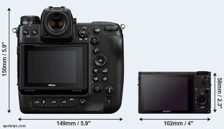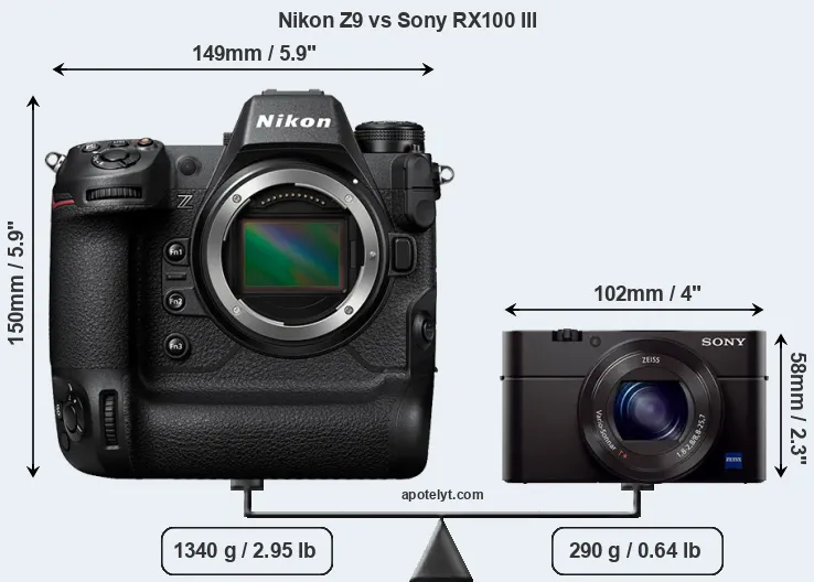 The side-by-side display below illustrates the physical size and weight of the Nikon Z9 and the Sony RX100 III. The two cameras are presented according to their relative size. Three consecutive perspectives from the front, the top, and the back are available. All size dimensions are rounded to the nearest millimeter.