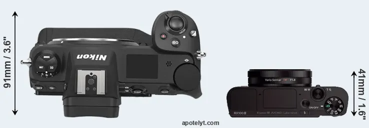 The above size and weight comparisons are to some extent incomplete and possibly misleading, as the RX100 III has a lens built in, whereas the Z9 is an interchangeable lens camera that requires a separate lens. Attaching the latter will add extra weight and bulk to the setup.