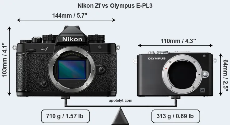 If the front view area (width x height) of the cameras is taken as an aggregate measure of their size, the Olympus E-PL3 is considerably smaller (53 percent) than the Nikon Zf. Moreover, the E-PL3 is substantially lighter (56 percent) than the Zf. It is worth mentioning in this context that the Zf is splash and dust resistant, while the E-PL3 does not feature any corresponding weather-sealing.