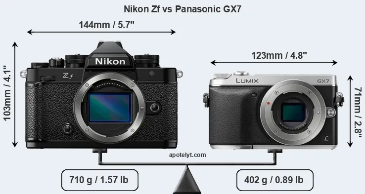 The physical size and weight of the Nikon Zf and the Panasonic GX7 are illustrated in the side-by-side display below. The two cameras are presented according to their relative size. Three consecutive perspectives from the front, the top, and the back are available. All width, height and depth dimensions are rounded to the nearest millimeter.