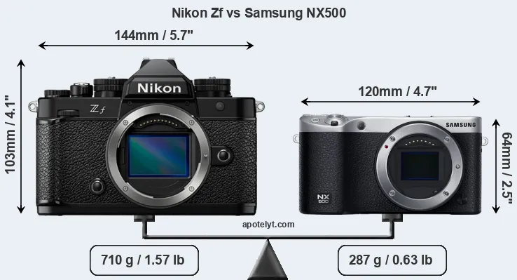 An illustration of the physical size and weight of the Nikon Zf and the Samsung NX500 is provided in the side-by-side display below. The two cameras are presented according to their relative size. Three consecutive views from the front, the top, and the rear side are shown. All width, height and depth dimensions are rounded to the nearest millimeter.