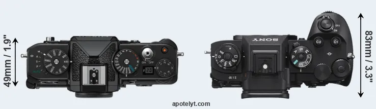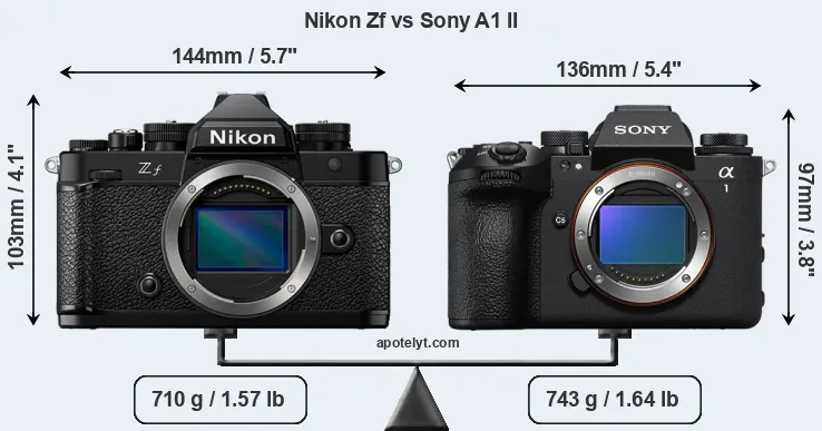 The physical size and weight of the Nikon Zf and the Sony A1 II are illustrated in the side-by-side display below. The two cameras are presented according to their relative size. Three consecutive perspectives from the front, the top, and the back are available. All width, height and depth dimensions are rounded to the nearest millimeter.